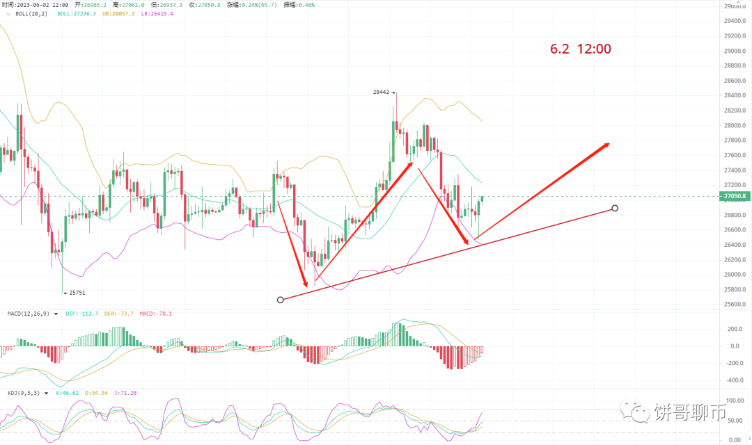又到了周五了,比特币的行情近日都是震荡下行的走势,冲高28500一线后未能延续,逐步回踩,目前回到27000附近运行。行情在非农数据公布之前选择止跌拉升,对于非农的操作主药趋势还是以多为主,好的行情往往需要沉淀,日线4连阴后今日目前也是成功止跌收阳,就目前而言有一定的止跌信号了,3次向下插针证明下方支撑力度较强,4小时级别来目前运行于中轨下方,MACD空头能量柱缩量,双线即将交叉,KDJ三线上扬,短线并不看好继续下行,日内思路低多即可,重点关注今晚非农数据。