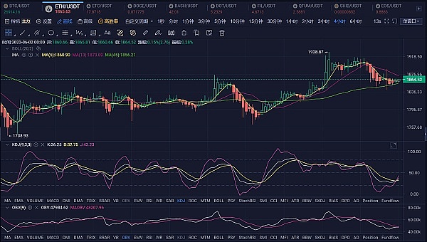 当前4小时级别中,价格1862在MA45均线处,价值暂时止跌。MACD快线下穿平均线后角度放大下行。 空头量柱也连续放量。日线方面指标均趋向于空方。 短周期走势关注MA45均线处的支撑位能否挺住,持续回踩破位价格指数空间继续回调低位支撑点。 短周期空头还有下行空间,反转没有得到量能和技术面支持暂时不宜做多