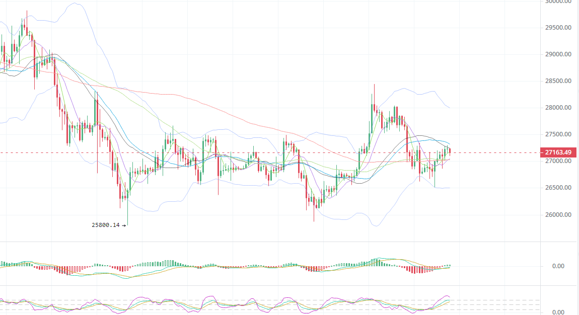 技术结构四小时级别来看,价格下探未能延续走低呈现收复上涨,多空量能得到转换以放量形态排列,运行通道在向下的缓慢进行中得到扭转收复,均线缓慢上扬延续,小周期修复上行还有进一步探高的需求,但带着较强的缓慢回调气息。一小时级别线中,运行通道形成向上延续的状态,量能以多头形态弱势维持,价格收复上行在高位窄幅修整,均线走势上表现孱弱焦灼,短线上震荡延续,上下力度都有一定限制,今日思路高位为主,低多为辅。昨日我们在文中给到27300-27500多空的思路。如果有看过文章的应该在27300是有布局空单进场的。交易思路参考6.2号发布文章的点位即可!