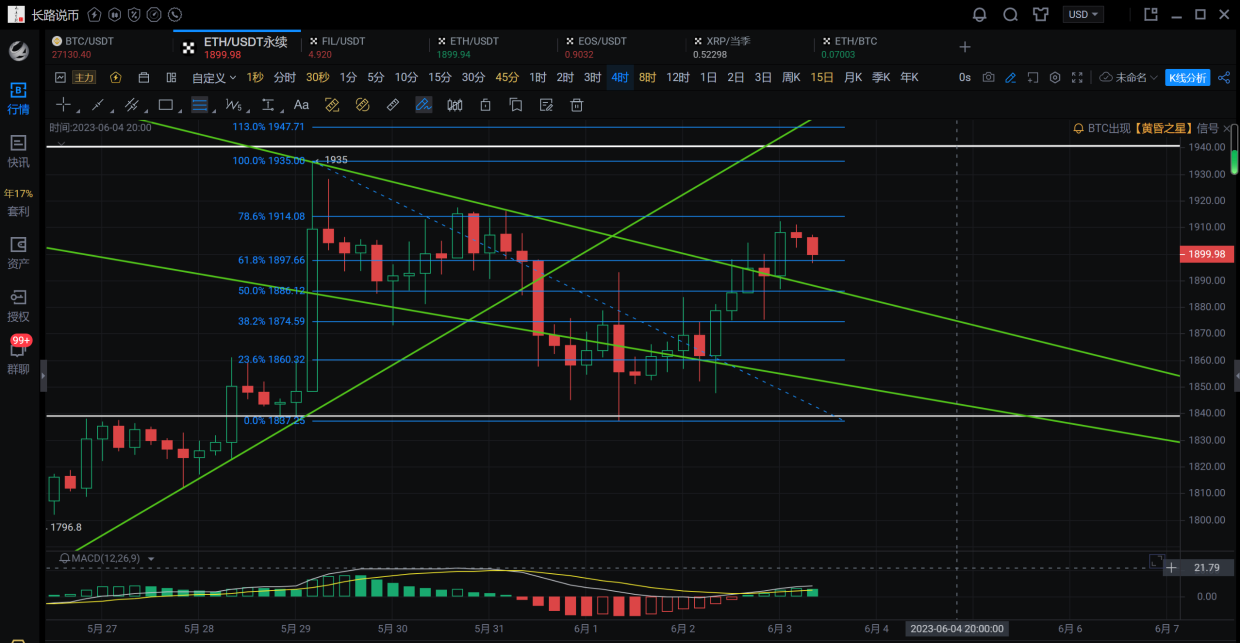 4小时线:昨天早间行情插针并未跌破下方下跌趋势线的支撑反弹,白盘一波拉伸,在1890附近震荡,晚间虽有回踩1875斐波那契0.382处并未跌破反弹,再次突破上方下跌趋势线的支撑反弹至0.786处回踩,价格虽有反弹,但量能并未得到释放,而随着5月份整个加密货币交易量的萎缩,大饼的上涨意愿并没有以太高,结合一系列的数据来看,行情仍有回踩的可能,1小时线,行情回踩至中轨附近获得支撑反弹, 昨天的一波拉伸行情今天有震荡整理的迹象,今天行情不跌破下方的支撑,那么震荡整理后将继续上行,昨天有高位空的朋友可 继续持有,下方关注1885附近的支撑,不破可反弹做多,若是能突破前高,那么行情有望走高。