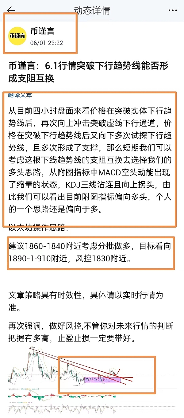 昨日晚间十一点多给出下行趋势线做多思路完美获利最高斩获50多个点的利润,六一晚间11:20分左右全网公开给出分批做多思路,在1860-1840附近分批做多,截止六月二号早间8点来到了我们理想进场点位1847附近,到我们晚间七点左右成功到达我们理想的盈利点位,最高来到了1904附近,最高斩获50多个点的利润