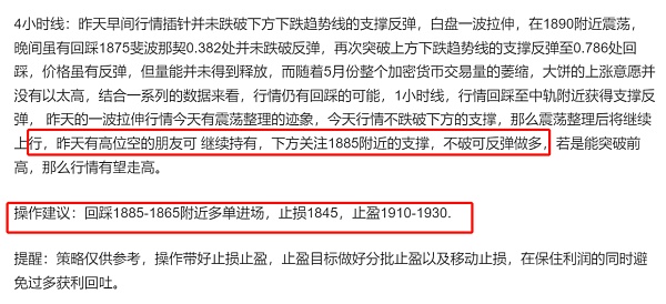4小时线:凌晨行情跌破了上涨趋势线的支撑回踩,跌至下跌趋势线的支撑位,昨天长路在文中也给出了行情有回踩的趋势,早间高点持有空单的朋友可以继续持有,下方关注1885的支撑,不破可多单进场,早间跌至1881附近反弹,实时策略中长路也给出了相应的空单,行情跌至中轨附近获得支撑反弹,走出两个影线,下方有一定的支撑,今天是周天,白盘大概率会先以震荡为主,上方去关注到1900的突破,不破的话,依然会有回踩下方支撑的趋势,若是跌破下方趋势线的支撑你那么可看到1850附近的支撑。1小时线,价格跌至下轨获得支撑反弹,短期来看行情下跌反弹,会有一段反弹的时期,若上方无法突破中轨1896附近的压制,那么又将继续下行。操作上长路建议,进多的朋友可看1896附近的突破,不破位可空单介入。
