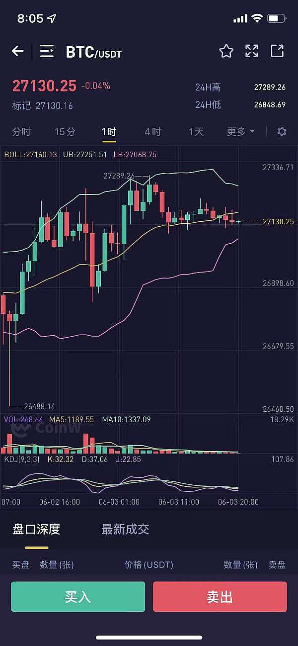恭喜,btc 在26787布局的多单,在27130附近通知离场,盈利300多个点,给力!如图: