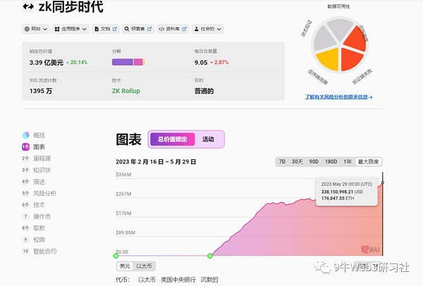 在总锁定价值(TVL)方面,去中心化交易所(DEX)是 zkSync Era 上当前最受欢迎的类别。SyncSwap、Mute.io 和 SpaceFi 是 Era 网络上最大的三个 DEX。在这些平台上进行交易类似于在以太坊的 DEX 上进行交易,但具有显著更便宜和更快的交易的优势。截至5月29日 zkSync Era 上TVL已达到3.38亿美金。