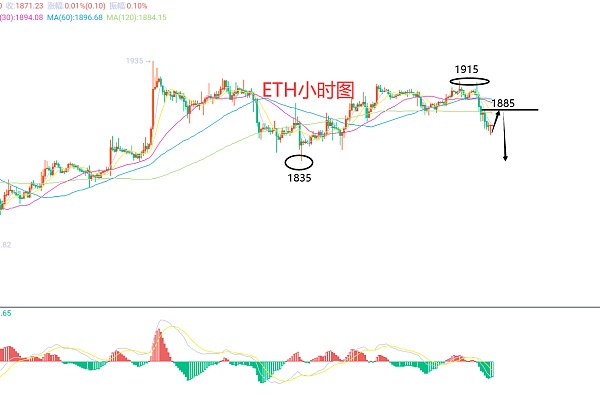 6月5日以太坊(ETH)合约技术面分析:今日方面,大周期日线级别昨日报收小阴线,K线形态上连阴单阳,附图指标金叉缩量运行,同样的前面也讲过了,在当前的走势来说价格容易出现二次承压回撤的走势,而周末就应对了我们的预期;短周期小时图早间价格冲高回落,高点位置还是在1915区域附近,这个位置也是多次承压下跌的位置,而低点位置还是在1835区域,而当前K线形态连阴下跌,附图指标死叉向下,趋势还是比较明显的,因此今日ETH短线合约交易策略:反抽1885区域空,止损1916区域,目标看1835-1810区域;