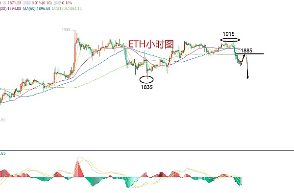 6月5日以太坊(ETH)合约技术面分析:今日方面,大周期日线级别昨日报收小阴线,K线形态上连阴单阳,附图指标金叉缩量运行,同样的前面也讲过了,在当前的走势来说价格容易出现二次承压回撤的走势,而周末就应对了我们的预期;短周期小时图早间价格冲高回落,高点位置还是在1915区域附近,这个位置也是多次承压下跌的位置,而低点位置还是在1835区域,而当前K线形态连阴下跌,附图指标死叉向下,趋势还是比较明显的,因此今日ETH短线合约交易策略:反抽1885区域空,止损1916区域,目标看1835-1810区域