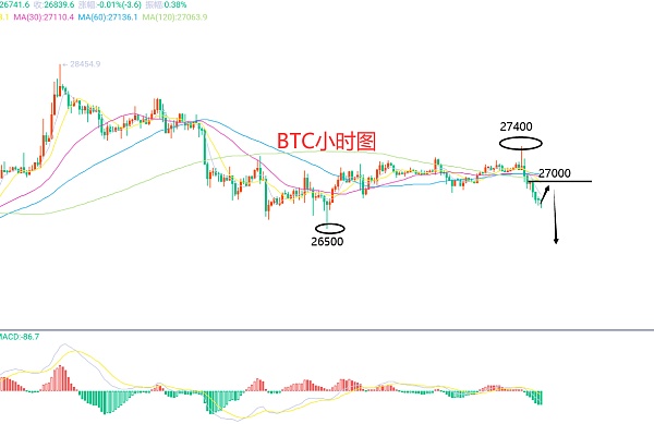 6月5日比特币(BTC)合约技术面分析:今日方面,大周期日线级别昨日报收小阴线,K线形态上还是连阴单阳走势,前面也讲过了,当前的走势来说,价格容易出现二次承压回撤的走势,而目前的趋势也是符合我们预期的,价格承压于27500区域;短周期小时图周末震荡,今日早间价格冲高回落,高点位置还是再27500区域,而前期的低点26500区域就是今日重点关注破位的位置了,当前K线形态连阴,附图指标死叉放量运行,下跌走势还是明显的;因此今日BTC短线合约交易策略:反抽27000-27050区域空,止损27400区域,目标看26350-26200区域;