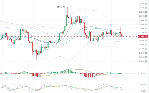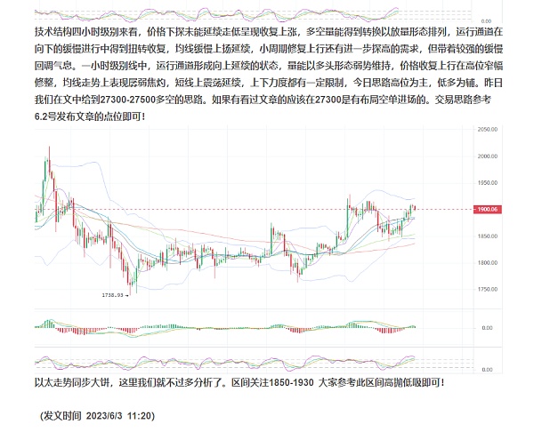 技术结构来看,日线级别中,运行通道形成持平状态运行,价格在中轨一线争夺,多头量能缩量,蓄力得不到维持,均线走势上略微偏弱,趋势上弱势修复延续,力度并没有表现出很明显的效果。四小时级别线中,价格企稳在中轨上冲高未能企稳,运行通道形成缩口向下状态,量能得不到连大幅度的释放,伴随着虽是转空的迹象,均线已经拐头明显,小周期震荡偏弱,下探有一定的延续需求,技术点位上方继续关注能否突破27500一线阻力,此位依然还是目前的强压力,一旦行情再冲破站稳此位之上,那么短线多头很有可能会借机拉升。反之若是结构不改,保持高空做空。那么前日给出的27300-27500高空思路可继续参考空单持有。从小时图看,布林带运行通道开口下行,k线由上轨下行至下轨下方。价格上还处于一个持续缓慢的走低,空头情绪强烈,下方关注26600/25800支撑,临近点位可小仓开多进场。