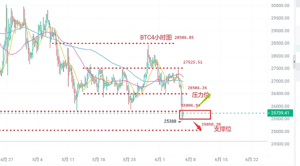 大饼昨日高点27130附近,低点25390附近。由于美国证券交易委员会指控币安出售未注册证券后,市场出现了崩盘,大饼直接跌破前期箱体下沿25800一线,短线快速走出向下插针行情,多头筹码几乎全部被扫,目前处在横盘调整中,短线看筑底能否成功,若成功就有机会再次站上26500上方,否则将要看到24000.