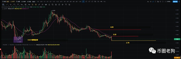 第二个就是ape,做为曾经NFT圈的龙头币种,APE最高涨幅曾经达到过20倍以上,这一轮的下跌价格并没有跌破去年年底的最低价格区间。从K线上来看,在去年年底拉升之前,ape在2.6—3附近吸筹了一段时间,之后价格开始上涨,之后经历过画门行情后价格在3刀上方稳步上涨。距离年内的高点涨幅也在2倍以上,短期如果不跌破2.78一线,价格有望继续回到3.3刀上方,如果3.3附近站稳价格将会向4刀附近进发。