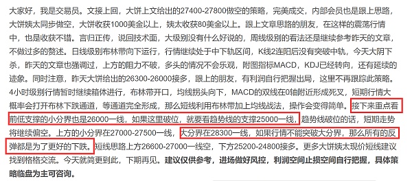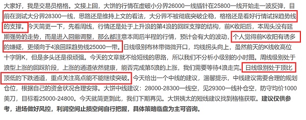 文接上回,昨天的大盘下跌,有人说是消息面的影响,格格在前2篇文章,重点的说了,大分界28300一线,这里不破所有的反弹就是为了更好的下跌,有人说价格到了28400一线,破了,我简单说说什么是破位,行情突破某个价格至少4-8小时一直在这个价格上方,这才叫破位。插针短时间叫虚破。周线的思路也是强调的很清楚,看好回踩趋势线25000的支撑,行情如期而至。姨太1885的空,也是收获近100美刀的空间。我们在市场博弈,除了技术面,就是人性,市场的买卖是人在操作,所以更多的时候是在考验人的耐性。通过分析判断进场位置,开仓之后,就要屏蔽一切的干扰,耐心的等待行情给出结果,而不是人云亦云。言归正传,今天简更一下,从之前的文章给出的思路,大饼行情走出来,经过下跌之后,技术面也不想去分析,既然行情如约回踩趋势线,那么现在我们就化繁为简,就从趋势线的这个方面去看,结构走出了第4浪回踩,完成回踩能否走5浪上涨,接下来的重点就看趋势线的支撑是否有效,毕竟刚刚才完成回踩,需要时间来测试,重点观察接下来12-24小时的K线情况。既然行情走到这里,我们就依靠趋势线先做个短线,大饼短线建议25100-24800一线接多,防守600-800刀。看26300-26600一线。今天的简更到此结束,咱们下期再见。姨太大饼更多实时短线找到格格。建议仅供参考,进场做好风控,利润空间止损空间自行把握,具体策略临盘为主可咨询。