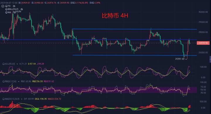 大饼4小时行情走势如昨日文中所料,行情在二次插针试探25300附近遇到强力支撑后反弹上涨,行情走出V型反转,目前行情承压27500下方,KDJ指标三线目前出现拐头,MACD指标红色空心动能柱放量增量,短线目前关注BOLL中轨附近支撑,日线行情6月6日K线呈实体大阳柱,并且形成一阳穿3线,6月7日K线目前呈阴K,行情目前跌破BOLL中轨一线支撑,KDJ指标三线呈金叉向上运行,MACD指标红色空心动能柱放量,目前来看多头形成反攻,这种看涨的条件更成熟,但是我们看到盘面即便有这种的组合,上一个星期依然并没有持续上涨,而是在周线上又开始收星线的,底部这个看涨k线组合目前还并未成功,多头力量暂时受阻。日线关注上方27500一线压力,综合来看:目前行情处于6月5日和6月6日行情上下扫盘后的窄幅震荡修复阶。三十分钟走势,再次回到27500~26350区间。反弹力度过大,有误导反转的诱导性。25300重要位置起到关键作用,28456以来的下跌已经结束。调整期价格不跌破26350则更大可能性25343是短期底部。是不是31068下跌以来的底还需要观察。操作上,没有好的建议,若回踩可以尝试支撑低多看看。