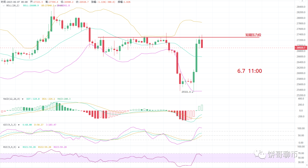 回到盘面,4小时级别来看,目前运行于布林中轨上方,布林带开口状,MACD多头能量柱增量,双线金叉,KDJ三线开始粘合,而日线方面行情再次回到前期区间震荡走势,凌晨的冲高未能延续,止步27400附近,几次冲高失败,短期可能要震荡,看这波回调力度如何,日内操作可以高空低多为主,短线不能突破27400/1910,做空,下看26400/1840,破位则继续下看昨日低点,未破位,则顺势低位做多,上看至27400/1910左右压力位,短线轻仓为主,做好止损,切勿上头!