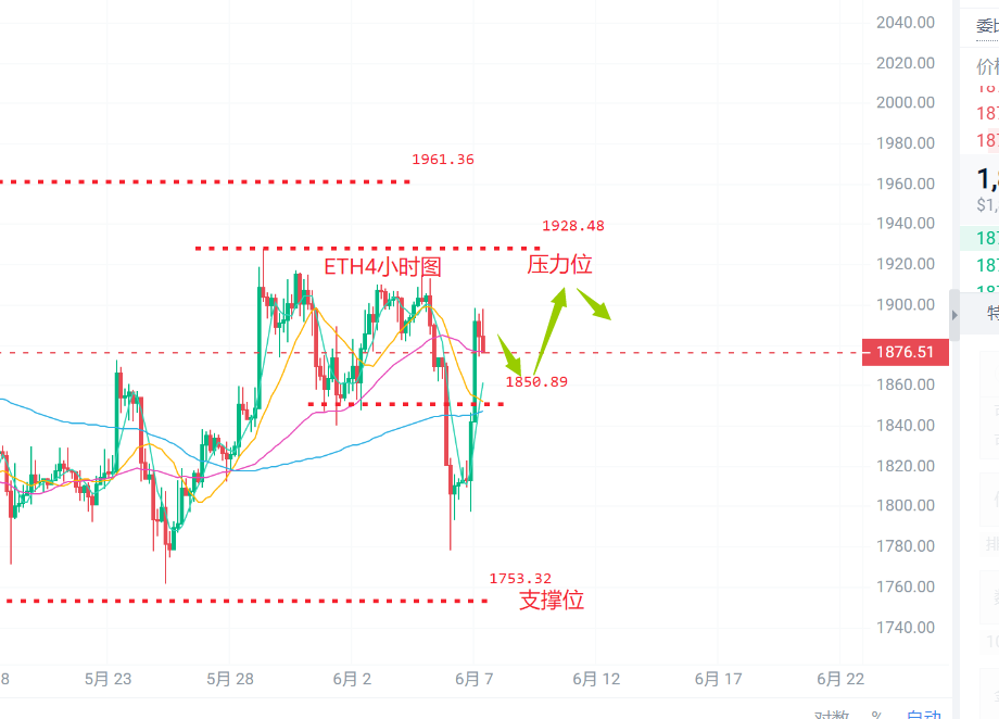 以太坊昨日高点1898附近,低点1797附近,以太在昨日日内走横盘调整,在晚间向下回落一波进行诱空,随后开始拉升直接突破1850压力,把前面的跌势全部给收了回去,目前在1880一带反复, 短期关注1930压力和1850支撑。