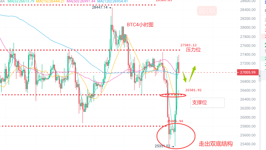 日线级别昨日收出大阳线, K线重回布林带内,受布林上轨28000压制,4小时级别走出双底结构,布林带开始平行运行,受布林中轨26600支撑,MCAD放量上行。操作上回调接多为主,建议回踩26500不破轻仓做多,目标27000-27500,上攻27500不破可轻仓短空。行情变化万千,具体操作以实时策略为主。