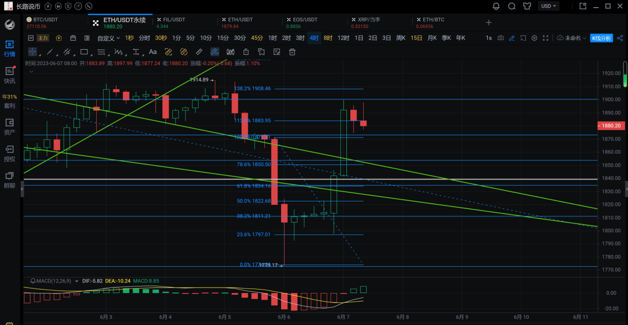 昨天长路在文中给出的反弹空单,可以拿下一波利润,结合长路在实时策略给出的多单,跟上操作的朋友多空都能拿下一波。而昨天长路在视频策略及实时策略中的1840附近防守空单,实时策略中长路觉得四小时走势太强事情不对,少赚出场。