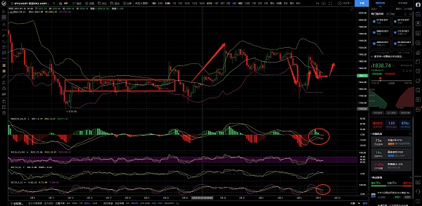 以太前天在早间承压于1913一线后展开震荡下行,晚间行情也在消息面的影响下瀑布来临下破1800关口,凌晨币价下探走低至1773一线,随后行情展开震荡修复,币价位于1810附近运行,随时行情呈V型走势拉升高位,如图我们可以看到,受压缓慢下探,空头放量后有所放缓回收,MACD多头放量后逐渐放缓,快慢线黏合在0轴下方,下探放缓。