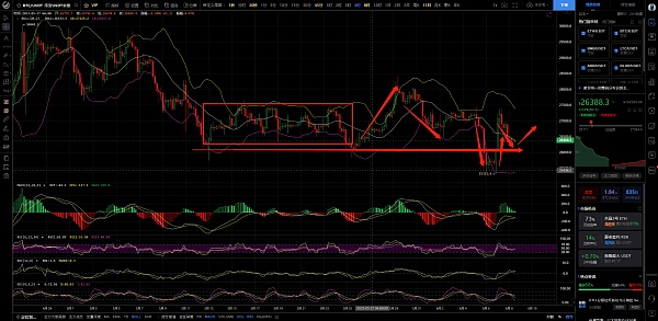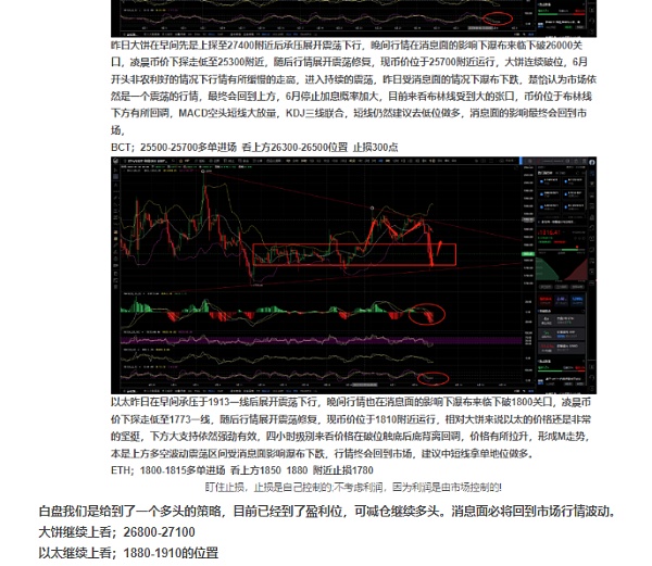 前天大饼在早间先是上探至27400附近后承压展开震荡下行,晚间行情在消息面的影响下瀑布来临下破26000关口,凌晨币价下探走低至25300附近,随后行情展开震荡修复,现币价位于25700附近运行,大饼连续破位,6月开头非农利好的情况下行情有所缓慢的走高,进入持续的震荡,受消息面的情况下瀑布下跌,后行情再次反转小区间震荡后行情再次多空来回,回调至高位,目前行情呈一个缓慢的下探趋势,再次进入小的震荡,楚怡认为仍然是一个震荡来回波动,四小时级别可以看到,目前币价位于布林线中轨处,MACD多头放量逐渐放弱处于0轴下方,KDJ三线粘合向下,
