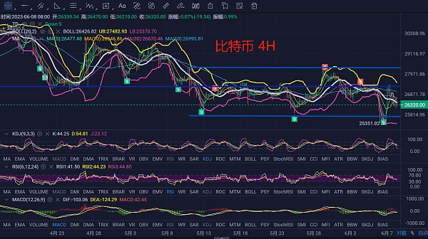 近两日连续日内涨跌2000余点,惊现画门行情,庄家洗盘仍然强势,但日内反弹依旧呈现弱势阶段,昨日大饼最高点打出27394高点,但并未企稳,最终仍然处于26500附近走日内震荡下行。上方连续两波放量无法打破高位压制,预计下方空间仍然会再次进行一轮下探,当前需要关注25350前期支撑,如若打破,本周仍然有新低可能。