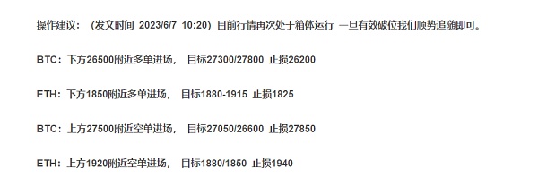 比特币昨日早盘小幅反弹至27400一线后并未有效企稳延续上行,而是一路震荡下跌,直至凌晨最低跌至最低跌至26100附近,目前币价维持在26300附近盘整修复。技术结构四小时图来看布林带缩口向下运行,K线在大阴下杀后,小幅度反弹并未有效突破布林带中轨,MACD双线交叉走平,多头能量柱持续缩量运行,KDJ三线交叉向下,价格也是呈现下行趋势,日内操作上建议高空为主先。下方关注第一支撑位 25800 以及25000一线强支撑,目前的走势九哥是建议在25800附近继续布局多单进场的 预留补仓空间放25300附近点位 止损25000下方即可。上方关注27000一线压制位,如行情反抽上行我们可以在27000附近小止损去布局空单。