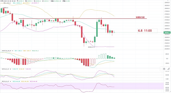 昨日比特币大阴下跌,从27400附近一路震荡下行,最低触及26100附近,日线方面也跌破布林中轨来到下轨上方,我们昨天文章提到过,短期的震荡看这波的回调力度,看这波能否跌破26400/1840,目前点位已经在附近震荡,就看是否会继续破位。
