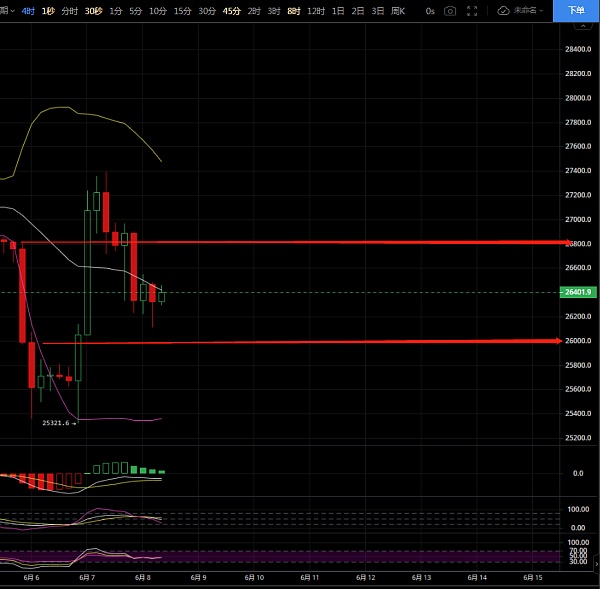因昨日强势拉升后盘面回归技术面的走势,日内从大盘走势来看的话处于一个拉升后的技术回踩,多空布局皆有空间可拿,日内行情整体走下跌趋势,昨日文章分析策略出现小小的失误,导致大饼26800的多单小损离场,只有26600的多单短线没有达到止盈目标,提前离场,以太是1840的多单也是在1870附近提前离场,目前1820的多单,还在持有中,整体来说,昨日大饼币价由27400附近回踩至26300一线,昨日多次测试下方支撑均未有效形成突破,26000一线整数关口支撑较为坚固,日线方面,我们可以非常明显的看到行情自昨日回踩后跌幅止步,短期进入区间修复阶段,MACD双线粘合平行运行,多空量能都没有给到明显放量,短期个人认为还会继续维持昨日区间盘整走势!咱们看看今日盘面走势。