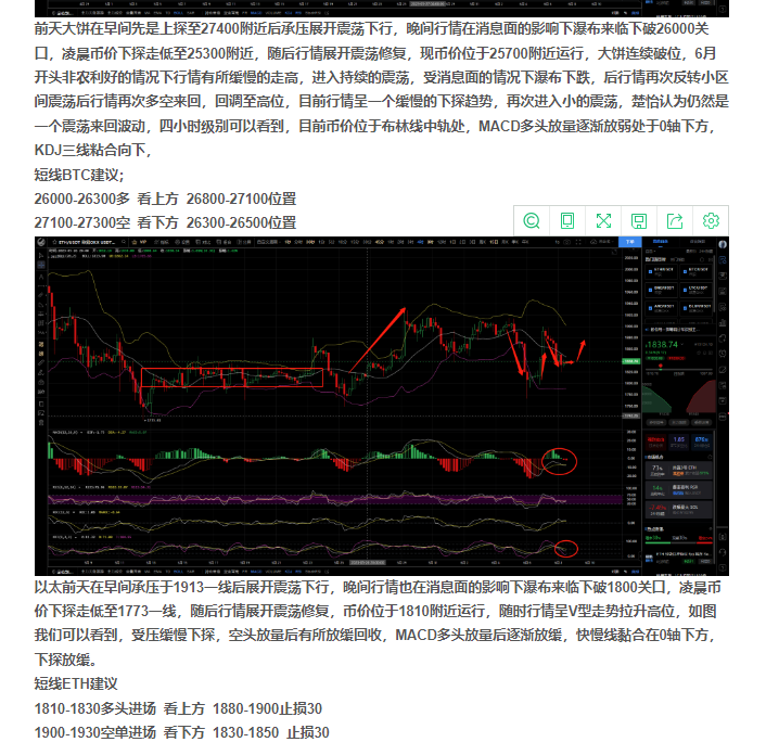 回顾5月的走势,5月初上半月开始行情一度的高位走低,空头趋势不断放量,后面不断冲破支撑位后底背离回调一度进入长时间的小区间横盘,大饼从30000的高位一路跌破26000,给市场带来了恐慌的情绪,以太坊在跌落后再次站上高位突破2000后持续破位最低触底1735反弹,行情进入了长期的一个持续震荡,行情低迷,在月底的时候行情才有所走高,但并未突破之前的高位,基本形成一个震荡行情的多空,但大饼看来要更加的无力,上个月我们也讲了行情会再次走高,6月新的开始行情有所走高后进入一个小的震荡,5月的非农数据也是超出预期利好,加息之路会有所放缓大概率不会加息,行情受到了瀑布式的下跌,大饼一度破位新低回到了3月份的价格最低触底25360,以太相对坚挺最低触底1773,目前均有所回调,币安受到SEC的指控行情走低,大量资金流出行情受到了下跌,资金依然会流向其他交易所,前面我们也是给到了多头的区间点位均 已止盈。目前市场仍然是个震荡行情。静待美联储加不加息消息前的震荡。