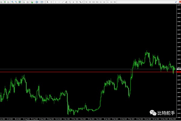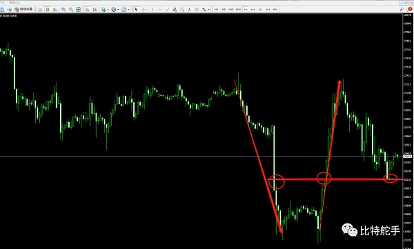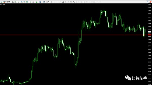 如图(日线图),日内我们将继续延续昨日日内进场的26300逢低多的持仓策略和思路。图中有一根红色线,这里是日内极限加仓或者稳健进场做多的位置,也就是25800,这里是前面2根针的最低价格。日内止损价格在25488即可。