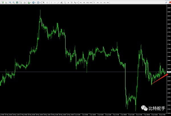 如图1小时,昨日盘面走箭头所示,日内小幅度震荡式上涨,全天也就那么400点区间上下。