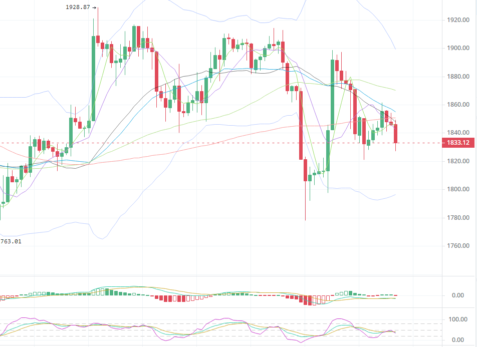 以太坊近日的走势在前期反弹之后,形成了震荡下行的节奏。行情的走势比较慢,目前依旧属于慢性回落的阶段中。在日线的结构中,依旧处于箱体震荡走势,行情并没有给到单边的机会,多空来回拉锯之后,目前形成的小幅的区间震荡,在四小时的结构中,前期的V型反转之后,还是走出了弱势下行的走势,随着高点逐步下移,反弹的力度不足,结合指标来看 MACD双线粘合 DKJ三线交叉向下运行,整体趋势偏空。上方压力位1880 下方支撑位1780 ,行情只要没有突破此区间 我们还是继续保持高抛低吸的节奏去进场交易即可。