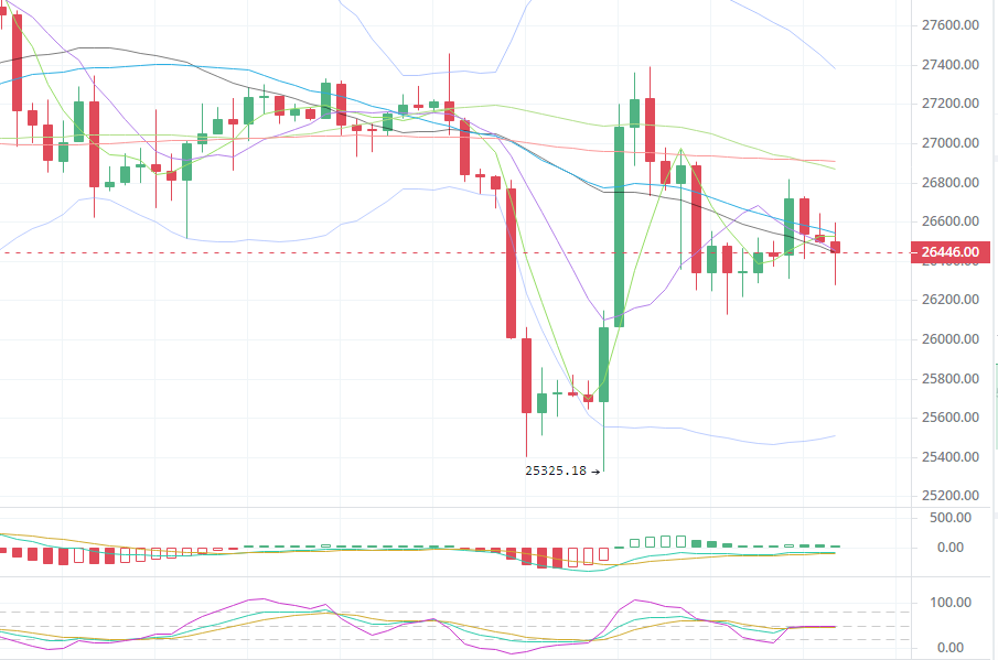 技术结构来看,四小时级别线中,布林带缩口状态运行,价格运行于中轨附近,中阳拉升后三连阴下挫,目前正在试探中轨,一小时级别线中,布林带缩口状态运行,k线贴合中轨附近运行,自早间一路阴跌下挫,MACD双线重叠焦灼,多头能量柱放量缓慢,延续性不强!KDJ三线交叉向下状态延伸,价格在中轨一线拉扯剧烈,多空量能转换频繁,都没有产生较大的释放,均线走势焦灼呈现粘合状态,小周期依旧是一个震荡缩幅偏弱的走势。盘面有回调修正需求,短线参考27000-26000区间小止损进场高抛低吸,止损200点 盈利目标300-500点,结合支撑阻力位的突破情况来选择离场或者做盈利保护。稳健交易者多单可以等待25600-25300区间去进场接多。 对于接下来的思路上我们保持高空为主,低多为辅。