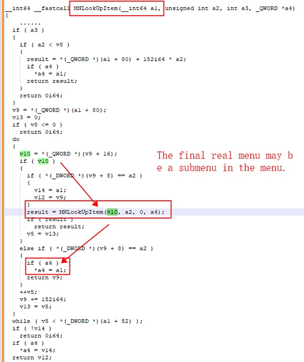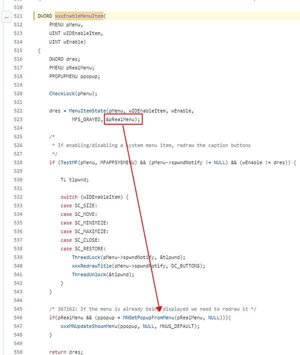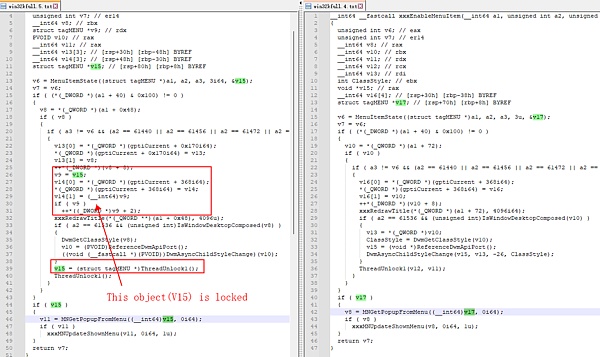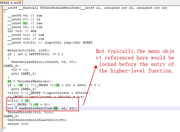 分析漏洞函数上下文,我们发现一个问题,传入到 xxxEnableMenuItem()的菜单,通常已经在上一层函数被锁定,那这里到底是要保护哪一个菜单对象呢?