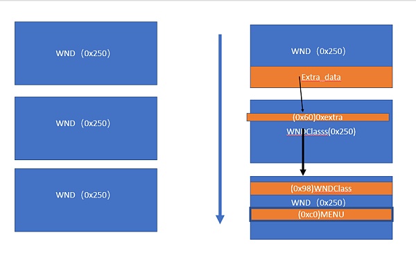 我们设计内存至少是连续三个 0x250 字节的 HWND 对象。释放掉中间那一个,构造一个 0x250 字节的 HWNDClass 对象去占用释放掉的 HWND 对象。