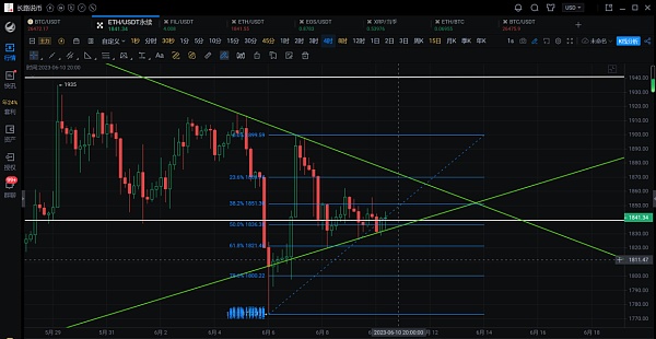 四小时线:昨天长路在文中和视频中都提醒反弹以空为主,多去关注1855附近的压制,空单可在这个位置附近进场,也提到下方1820斐波那契0.618黄金分割点的支撑,今天是周末,行情大概率又将围绕1840附近做震荡运行,值得注意的是随着以太坊价格波动的降低,行情的反弹力度在进一步减弱,多空对于1840这个关键位置的抢夺异常激烈,做短单的朋友,长路建议可以在这个位置附近做高抛低吸的动作,周末行情波动较低,可以主动出击短单制胜。上方仍继续关注1855附近的压制,下方则去关注1820附近的支撑。