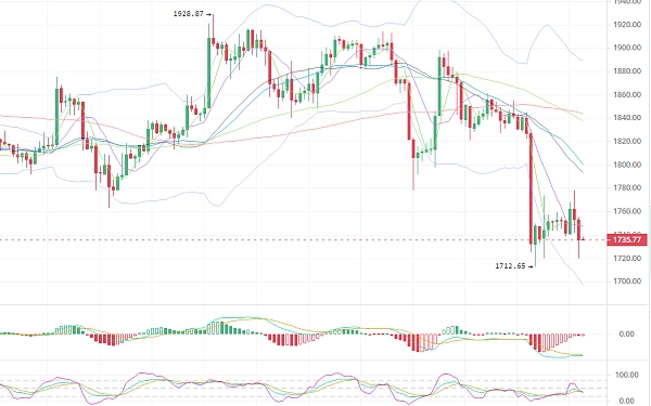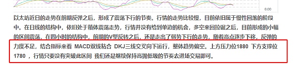 昨日晚间姨太价格在1740附近震荡,凌晨拉升至1778一线。后续开始回落,早间低点下探至1720附近,目标姨太价格处于1730一线震荡。从四小时级别线上看,布林带运行通道缩量运行,一根大阴k插针下轨,k线沿下轨一线运行,价格承压于中轨。目前空头量能减弱,上方1780成为压制点位,下方关注1700支撑情况,从一小时图上看,布林带平稳运行,k线沿中轨迂回运行。上方压力点处于上轨一线,无法突破上方承压。空头量能减弱价格上会有小幅度反弹,但是整体走势偏弱,短周期内还是建议反弹做空为主。下方可以参考1700下方止损布局反弹多单。