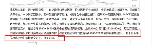 技术结构来看,四小时级别线中,价格大阴回落后收复,未能延续走低,在阶段性的整理后得到一定的回暖,运行通道呈现缩口状态,整体行情依旧在下跌趋势内测,反弹力度较弱,行情多次拉升突破26100附近回调,现阶段仍处于筑底吸筹阶段,下方关注25000支撑,均线焦灼粘合勾头上扬,量能有转多释放的迹象,放量还需要进一步的蓄力,空间还有待突破。一小时级别线中,价格震荡上冲后回调,但空头空间受到局限,目前回探并没有下触反而形成稳步走高,多头量能维持排列,均线迂回勾头,现阶段性的震荡整理中,价格可能会伴随一定的回调,但主要还是以冲高收复为主,接下来的思路上我们可以调整为低多为主,高位测压不破做空为辅。