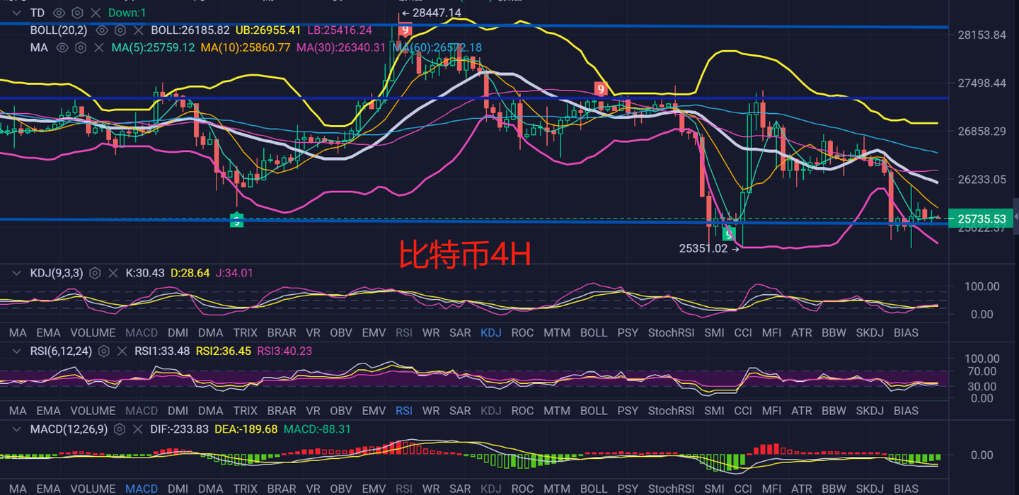 昨天午间时刻大饼走出一段短而快下跌行情止跌于25300,全日波动由日内高点下跌至25300收盘在25826整体下跌2.42%,日线收一段带有明显下引线的阴K线止跌与25300;没能如期有效跌破重要支撑,意味着该支撑有效后势需要关注25300破位的空头机会只有有效破位才能将空头目标下看至24000一带。