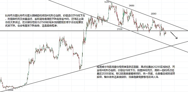 6月12日比特币(BTC)行情解读及部分合约交易策略:比特币方面比特币方面大周期日线级别K线形态连阴,价格运行于均线下方,附图指标死叉放量运行,当前趋势是明显下跌走势当中的,记得在上周也给大家讲过,在关键价格阻力27500区域承压回撤后即使不会出现爆发式的下跌,也会有震荡下跌走势,这是趋势规律;短周期小时图凌晨价格反弹后承压回撤,高点位置在26200区域附近,而当前K线形态连阴,价格在均线下方,附图指标死叉,而前一日的低点位置在25350区域,所以欧盘是要看破低的,另一方面,也是看日线的连阴延续,整体走势还是偏空的,但是稳健需要等待回调入场;因此今日BTC短线合约交易策略:反抽26200区域短线空,止损26500上方区域,目标看25700-25350区域;日内下方支撑区间25350考虑多单进场,止损25000位置,目25850-26000;短线交易,控制风险,盈亏自理;