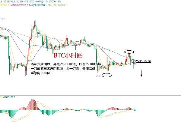 6月12日比特币(BTC)合约技术面分析:今日方面,大周期日线级别K线形态连阴,价格运行于均线下方,附图指标死叉放量运行,当前趋势是明显下跌走势当中的,记得在上周也给大家讲过,在关键价格阻力27500区域承压回撤后即使不会出现爆发式的下跌,也会有震荡下跌走势,这是趋势规律;短周期小时图凌晨价格反弹后承压回撤,高点位置在26200区域附近,而当前K线形态连阴,价格在均线下方,附图指标死叉,而前一日的低点位置在25350区域,所以欧盘是要看破低的,另一方面,也是看日线的连阴延续,因此今日BTC短线合约交易策略:市价25850区域直接空,止损放在26200区域,目标看25300-25000区域;