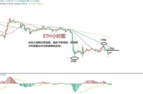 6月12日以太坊(ETH)合约技术面分析:今日方面,大周期日线级别K线形态连阴单阳形态,价格运行于均线下方,附图指标死叉向下放量运行,而当前趋势下跌明显且有效跌破了前期低点位置;而在短周期小时图今日凌晨反弹早间承压下跌,高点位置在1780区域,低点位置在1713区域,当前K线形态连阴下跌,附图指标死叉向下,所以今日还是要看日线连阴以及短周期在欧盘上破低的走势,因此今日ETH短线合约交易策略:反抽1750区域空,止损1781区域,目标看1700-1680区域;