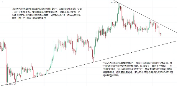 6月13日以太坊(ETH)行情解读及部分合约交易策略:以太坊方面大周期日线级别K线在大阴下跌后,本周以来都是阴阳交替,运行于均线下方,整体呈现低位盘整的走势。短期走势上看每一次短线大跌之后价格都很难形成延续性,周末探底1714一线后再次步入震荡,而上方1760-1780明显承压。今天八点半将迎来重要数据CPI,再结合当前比较纠结的行情走势,预计CPI将会成为决定走势的关键因素,所以今天,重点关注数据,一旦CPI利空的话,预计会加速空头破位下行,甚至直接打破日线这段时间的震荡结构,相反若数据利好,那么币价可能会再次依托1700-1720区间支撑迎来反弹。因此今日ETH短线合约交易策略:反抽1780域空,止损1806区域,目标看1720-1700区域;日内下方支撑区间1700考虑多单进场,止损1672位置,目标1750-1772;短线交易,控制风险,盈亏自理。