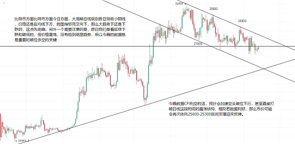 6月13日比特币(BTC)行情解读及部分合约交易策略:比特币方面比特币方面今日方面,大周期日线级别昨日报收小阴线,价格还是在均线下方,附图指标死叉向下,那么大趋势下还是下跌的,这点先明确,另外一个需要注意的是,昨日我们是看延续下跌和破低的,但价格震荡,没有给到明显趋势,所以今晚的数据就是重要的破位多空的关键了,CPI利空的话,预计会加速空头破位下行,甚至直接打破日线这段时间的震荡结构,相反若数据利好,那么币价可能会再次依托25600-25300区间支撑迎来反弹。因此今日BTC短线合约交易策略:反抽26300区域短线空,止损26650上方区域,目标看26600-25600区域;日内下方支撑区间25500考虑多单进场,止损25200位置,目25850-26000;短线交易,控制风险,盈亏自理;