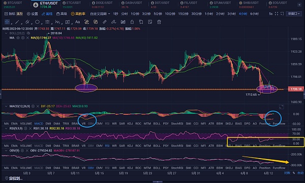 大的周期:周线,和日线均到了多空变盘点。剑指下方空头区间。 当前4小时走势中MACD在0轴下方深处平行相交无拐头上行迹象,多头无量收阳。RSI在30值空头区域附近反复波动,暂无指向性回暖形态。整体走势震荡下行为主