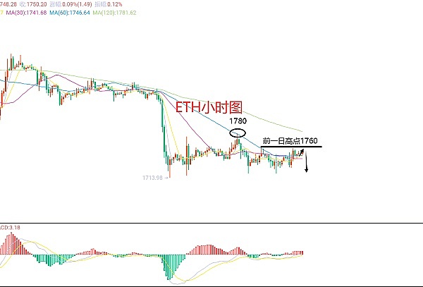6月13日以太坊(ETH)合约技术面分析:今日方面,大周期日线级别昨日报收小阴线,价格还是运行在均线下方,附图指标死叉向下,而当前价格出现小幅反弹走势但昨日整体陷入区间震荡,没有破高也没有破低,那么今日的重点就在欧盘的强弱和破位情况;短周期小时图在上周爆发下跌后价格处于低位震荡,高点位置1780区域,而昨日高点位置在1760区域附近,而在大周期上整体走势还是下跌明显,因此今日ETH短线合约交易策略:反抽1760区域空,止损1781区域,目标看1720-1705区域;