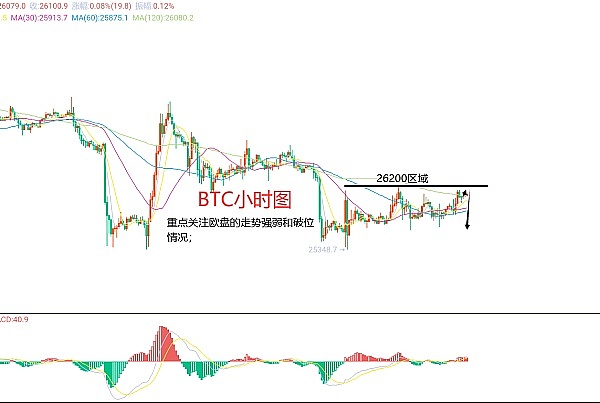 6月13日比特币(BTC)合约技术面分析:今日方面,大周期日线级别昨日报收小阴线,价格还是在均线下方,附图指标死叉向下,那么大趋势下还是下跌的,这点先明确,另外一个需要注意的是,昨日我们是看延续下跌和破低的,但价格震荡,没有给到明显趋势,那今日欧盘就是重点了;短周期小时图没有很多需要强调的,注意高点26200和低点25600两个位置在欧盘的破位情况即可,因此今日BTC短线合约交易策略:反抽26200区域空,止损26500区域,目标看25500-25300区域;