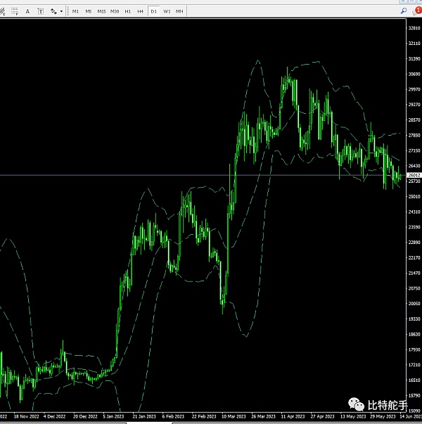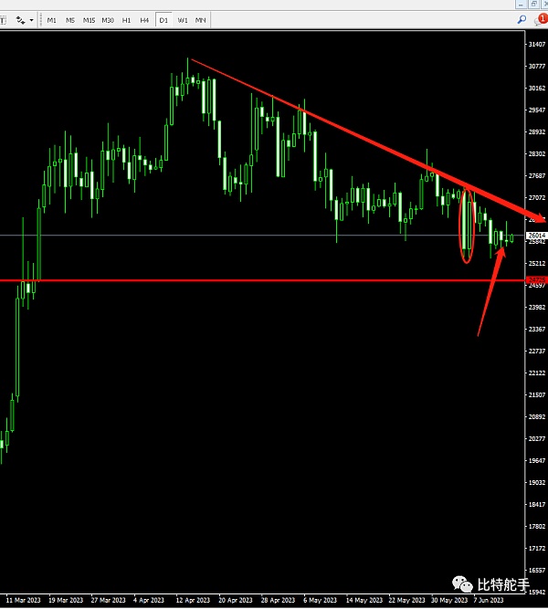 日线至30500回落以来,一直走震荡下跌,高点不断下移的锯齿形回落。图表看,圈圈内的大阴,这里是美国sec对于cz的起诉引发的数据性的行情加速运行。反复测试了25300的支撑位置,近几个交易日一直在低点之上横盘震荡。昨日收出十字星的变盘信号的预警。