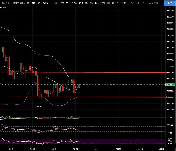 昨晚CPI数据低于预期4.1,公布4.0,继续大幅度缓解通胀, 对于盘面有所提振,但是整体影响不大几乎可以忽略不计,技术结构还是维持小区间震荡循环拉扯,今晚凌晨2点的不加息预期上升至90%以上,则大概率不会加息而利好市场,但是鲍威尔讲话可能会考虑到衰退问题而继续模棱两可,增加不确定性,今天凌晨2点的币安听证会取得初步胜利,币安与SEC达成初步妥协方案,周四再度协商,这是个持久战,但是暂时稳住负面FUD延续,昨天晚上的走势冲高也差点意思,回落也差点意思,所以今日个人认为今日还在25500-26500之间震荡,等待今晚半夜的选择方向。咱们看看今日盘面走势情况。