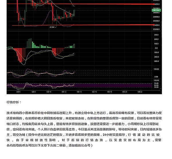 四小时结构技术图,可以看到五连阳后一根阴线从上轨跌至中下轨,触及支撑后止跌反弹,单阴后走出三连阳震荡上行,昨日拉伸至26400区域承压下行,而后跌到25730区域止跌反弹,短期来看空头未能延续,目前整体趋势走反弹,整体结构走势来看,行情震荡上行,底部上移,高位突破,多头情绪浓郁,MACD多头能量柱放量,kdj三线有拐头上行的迹象,RSI走势还是比较焦作,目前行情整体回调力度偏弱,操作建议低多为主高空为辅进行操作。