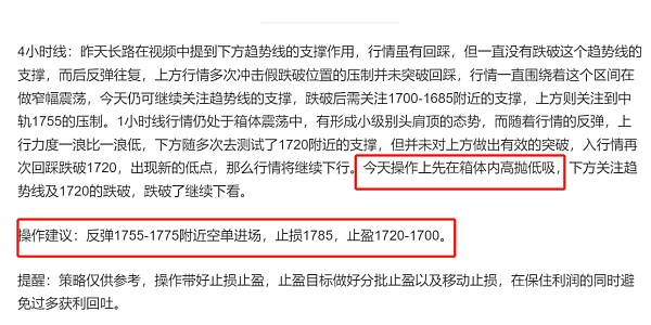 4小时线:昨天行情一直位于上涨趋势线上方运行,晚间插针1767附近回踩,跌破了上涨趋势线的支撑,而后一直冲击趋势线的压制都没有突破,昨天长路给出的可先围绕箱体内进行高抛低吸的操作,而行情在内有站上1.13假跌破位置压制后回踩,随着行情的不断运行,趋势线的压制会越来越高,若无法站上,那么价格又将有走低的可能,四小时线布林带同样处于平整运行状态,若要行情波动加剧,那么需走出这段区间,而现在4小时线中轨成为上行的压力位,若要突破则需站上1745附近的压制,再寻求新的变化。一小时线行情一直处于窄幅震荡中,而上行的力度依然疲软,不排除还要继续回踩的可能,今天操作上长路建议仍可在1720-1760之间高抛低吸,但一定要带好止损,长时间的震荡修复,会有变盘的风险。