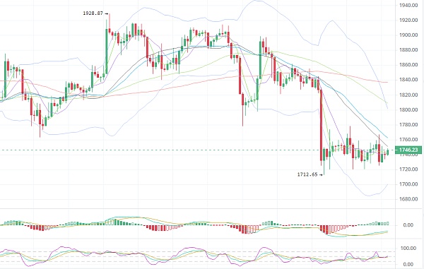 以太连续几天震荡。昨晚cpi公布利好后向上拉盘但没有延续前期cpi单边上涨行情依旧在震荡区间之内。当前四小时级别价格实体始终没有能够突破中轨。阴k上影线更长一些。说明上方承压比重,下方继续关注1720-1700区间支撑。这里我们不过分看单边行情,短期参考1720-1770区间来高抛低吸即可。止损15点 目标20-40点,落袋为安!